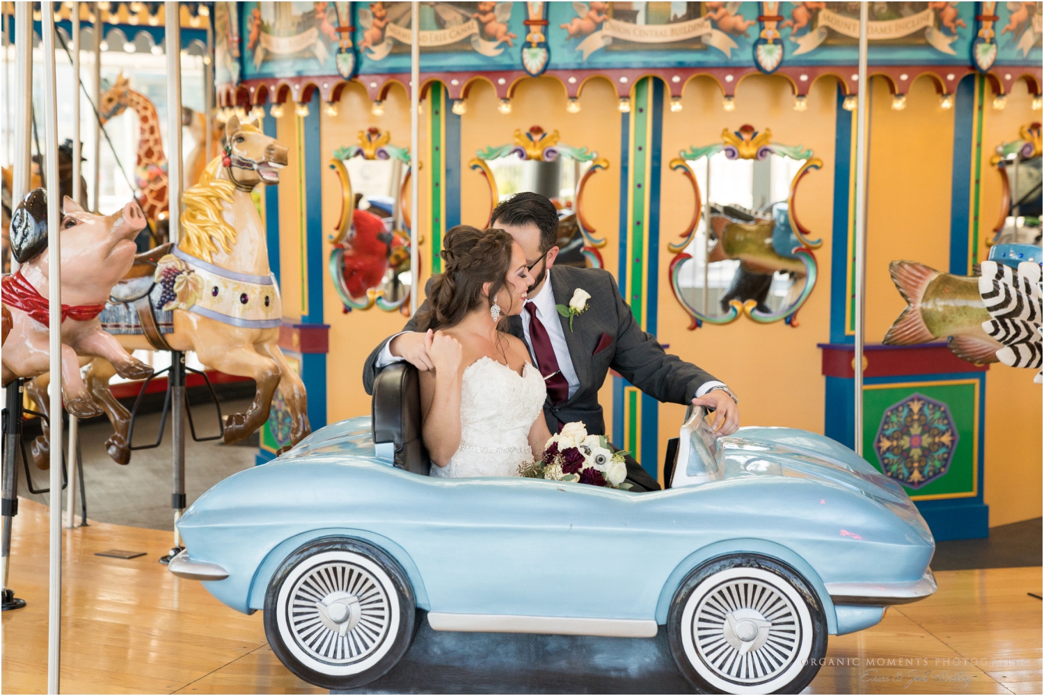 One really cool thing about the Anderson Pavilion was it actually had a carousel for all of the guests to ride! It was really cool. And in the evening, they served an appetizer that was kind of out of this world: The Cincinnati Cheese Coney. It was pure hot dog bliss! One of the main reasons John and Shannon picked the Anderson Pavilion as their wedding venue was because of the Cincinnati landmarks. The Roebling Bridge was incredibly important for them to capture as well as all of the great Cincinnati-based rides.