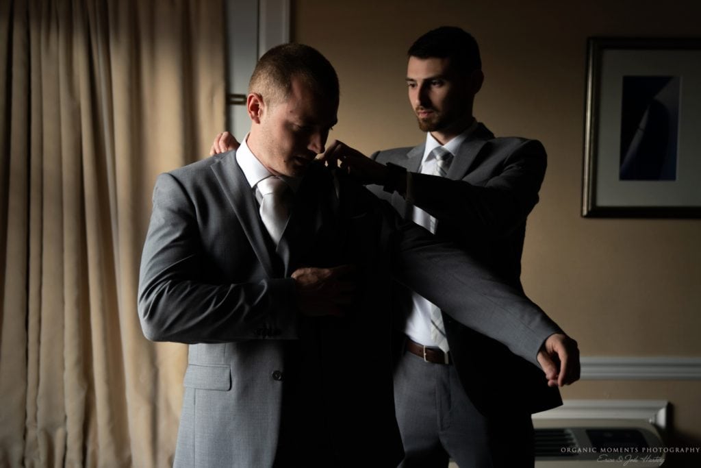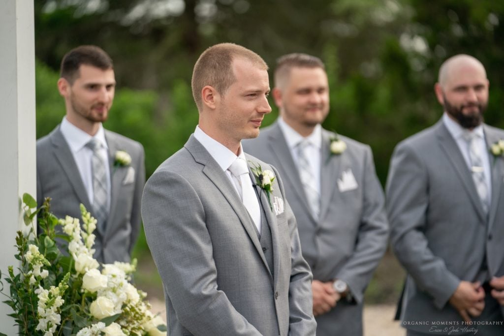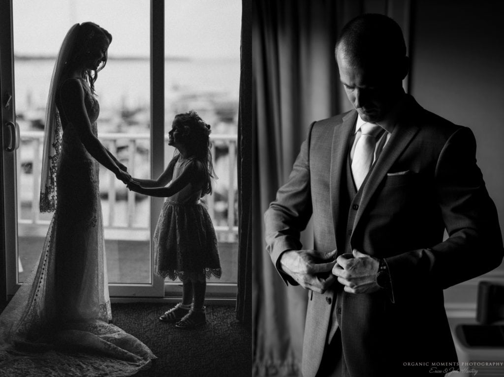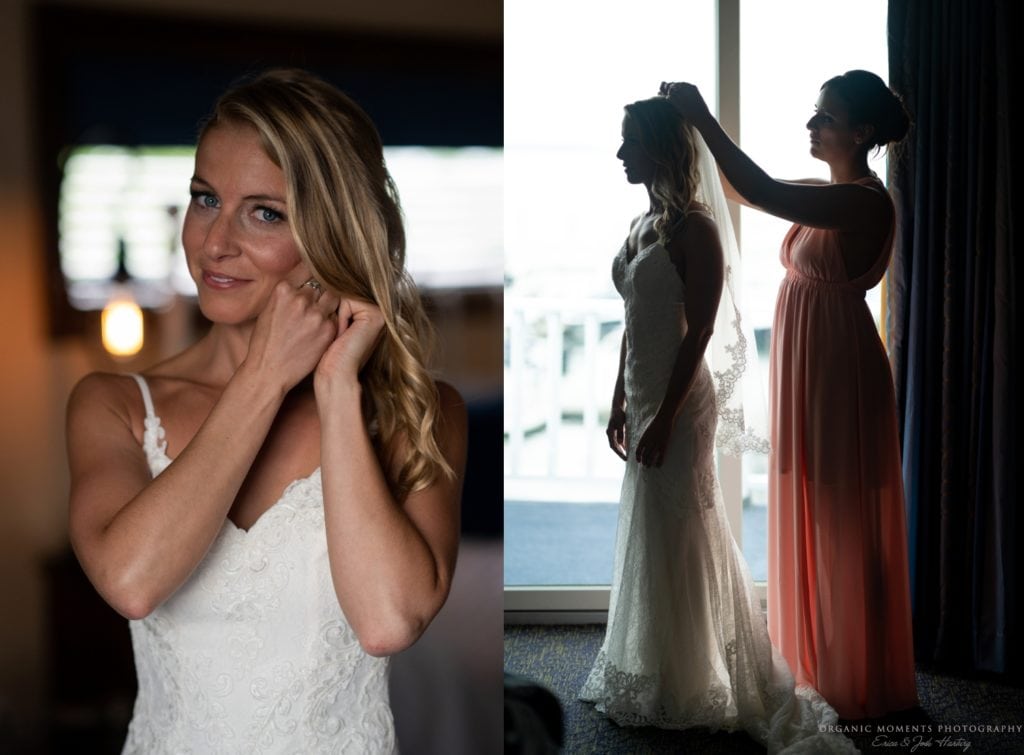 On the day of the wedding, we started at Danford’s Inn in Port Jackson with Christy as she got ready. The light in her room was beautiful, as she and her bridesmaids started the day with champagne. The ladies all wore matching floral robes as they helped Christy into her stunning Essense of Australia gown. Meanwhile, Dwayne and the men got ready and looked so handsome in their grey suits.